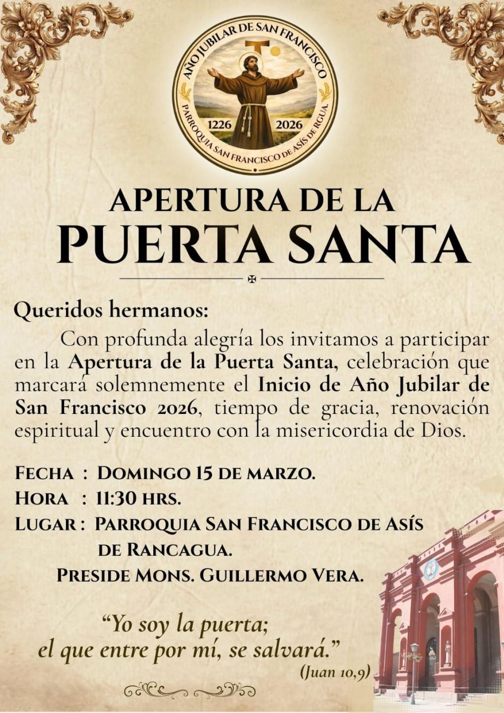 La Parroquia San Francisco de Asís de Rancagua invita a toda la comunidad a participar en la Apertura de la Puerta Santa, celebración que dará inicio al Año Jubilar de San Francisco 2026, un tiempo especial de gracia, conversión y renovación espiritual para los fieles.