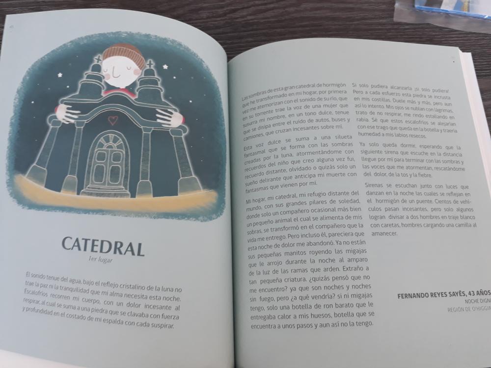 René explica que su cuento se basa en la historia de una persona en situación de calle, que falleció y fue tratado bajo el protocolo Covid. “A don Carlos la gente le decía siete bolsas, porque tenía el mal de Diógenes. Él siempre estaba en el paradero antes de llegar al Hospital Regional de Rancagua. El cuento trata de la muerte en soledad en tiempos de pandemia, con todo acordonado, con personas vestidas de blanco”, dice René y aclara que “en el cuento, el final queda abierto y tampoco se produce en el paradero, sino bajo un puente por eso se llama catedral, por las columnas, como un refugio, un hogar”.