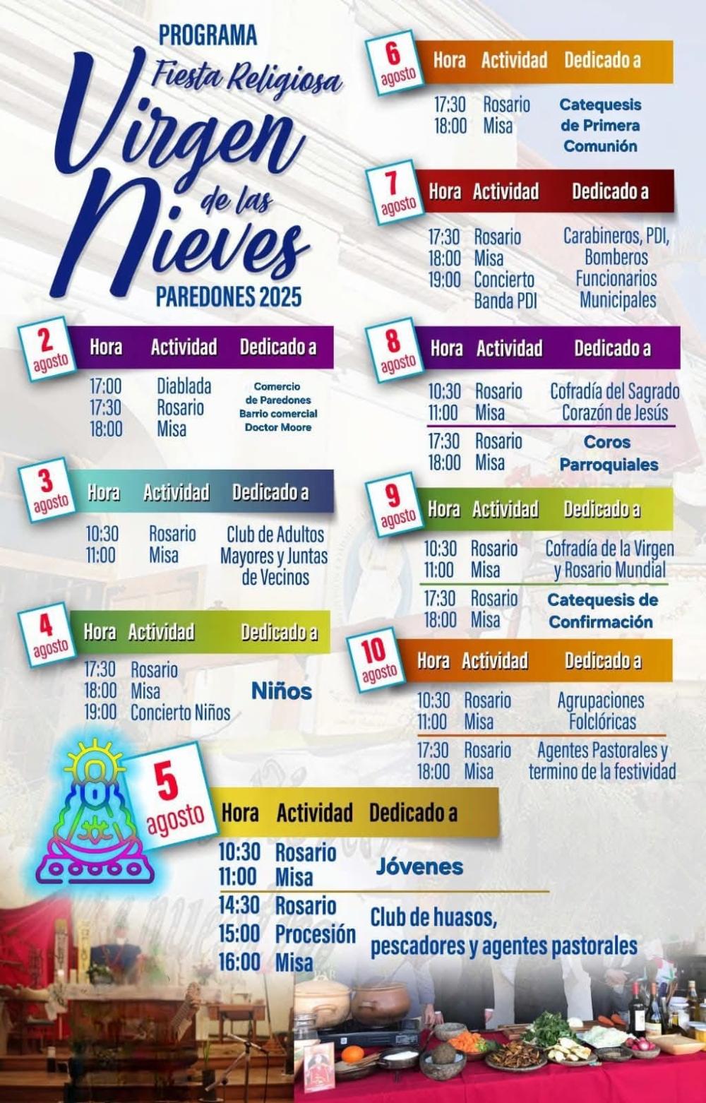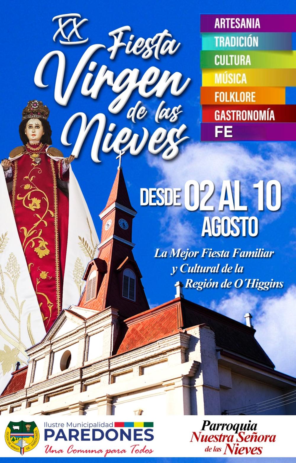 La comunidad parroquial de Nuestra Señora de las Nieves y la Municipalidad de Paredones invitan a vivir con profundo gozo la tradicional Fiesta Religiosa de la Virgen de las Nieves, que se desarrollará entre el 2 y el 10 de agosto en esta localidad de la Región de O’Higgins.