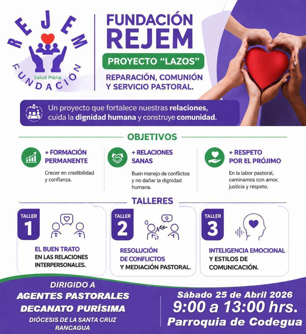 La Fundación REJEM realizará una capacitación dirigida a los agentes pastorales del Decanato Purísima el próximo sábado 25 de abril, entre las 09 y las 13 horas en la parroquia Nuestra Señora de La Merced de Codegua.